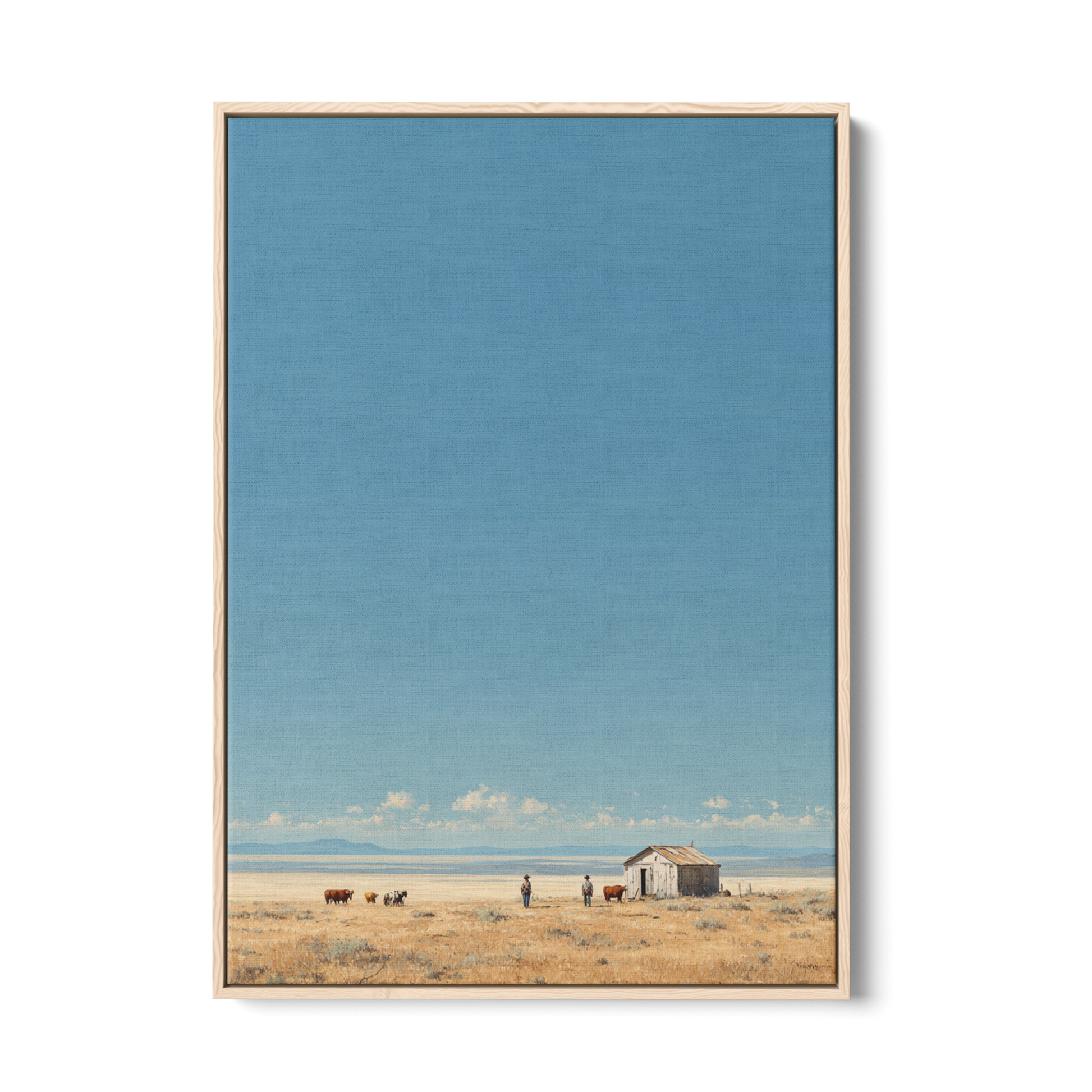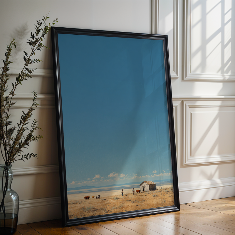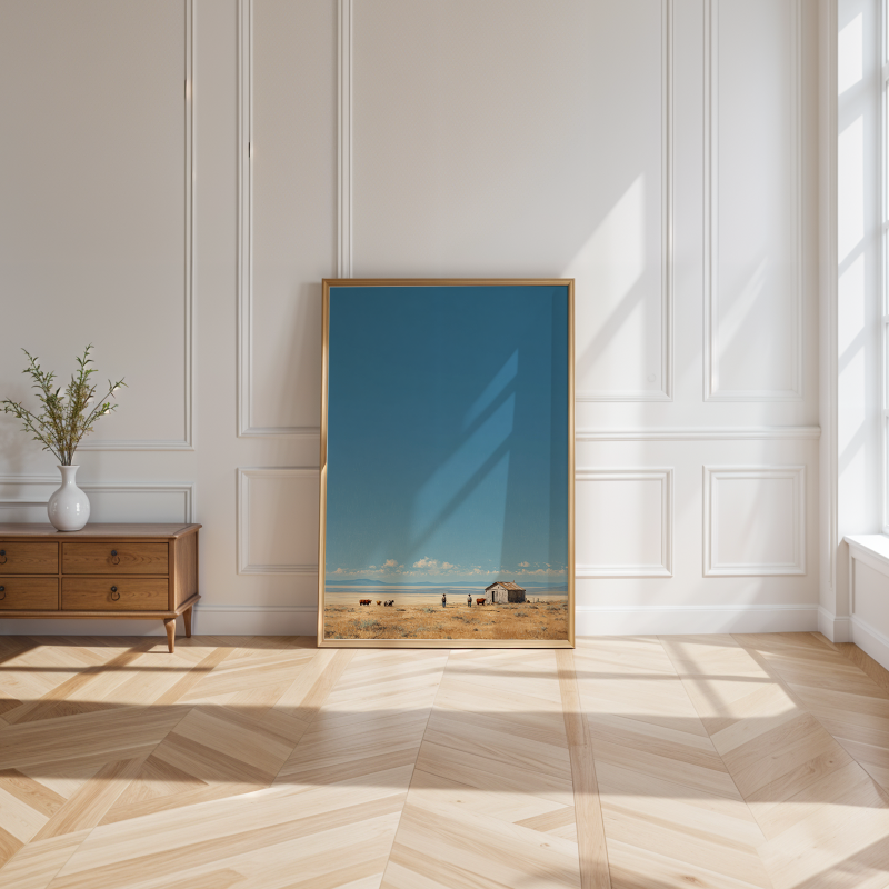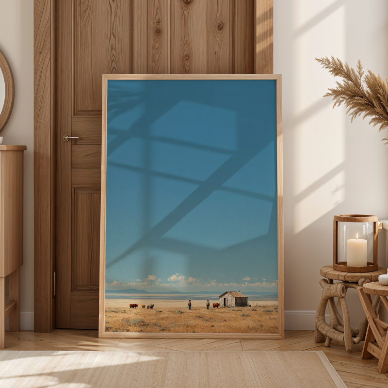 Washed in soft morning light, Desolate Horizons captures the stillness and cinematic solitude of the open plains, where sky and earth meet in quiet harmony. With its serene palette of warm golds and gentle blues, it brings a sense of calm narrative and refined space. Printed on Giclee-grade, archival paper with pigment inks, it preserves every subtle detail for timeless, understated elegance.