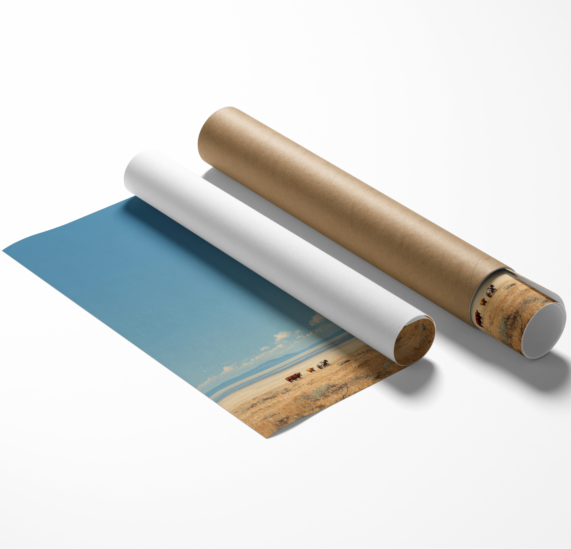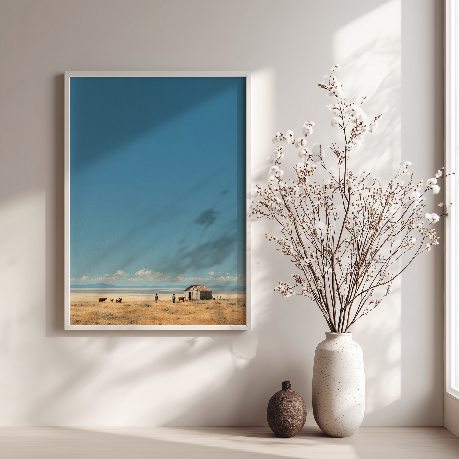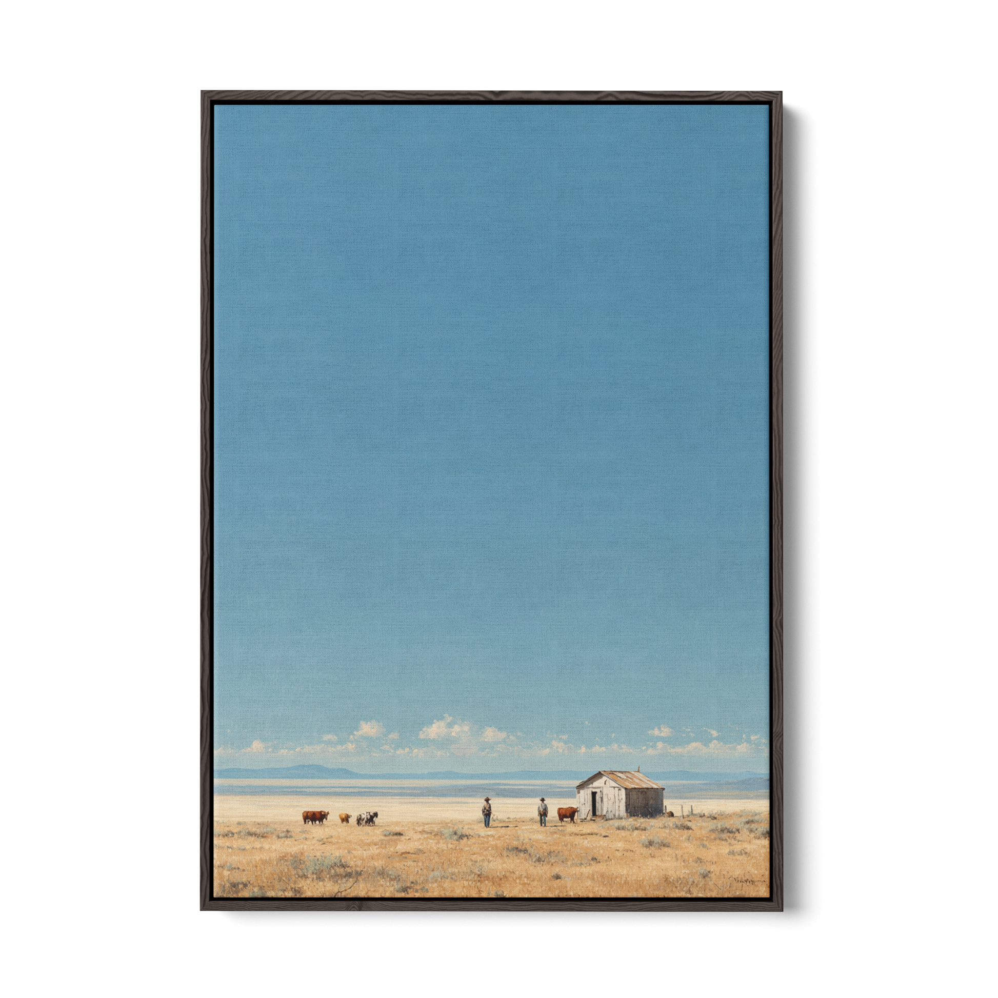 Washed in soft morning light, Desolate Horizons captures the stillness and cinematic solitude of the open plains, where sky and earth meet in quiet harmony. With its serene palette of warm golds and gentle blues, it brings a sense of calm narrative and refined space. Printed on Giclee-grade, archival paper with pigment inks, it preserves every subtle detail for timeless, understated elegance.