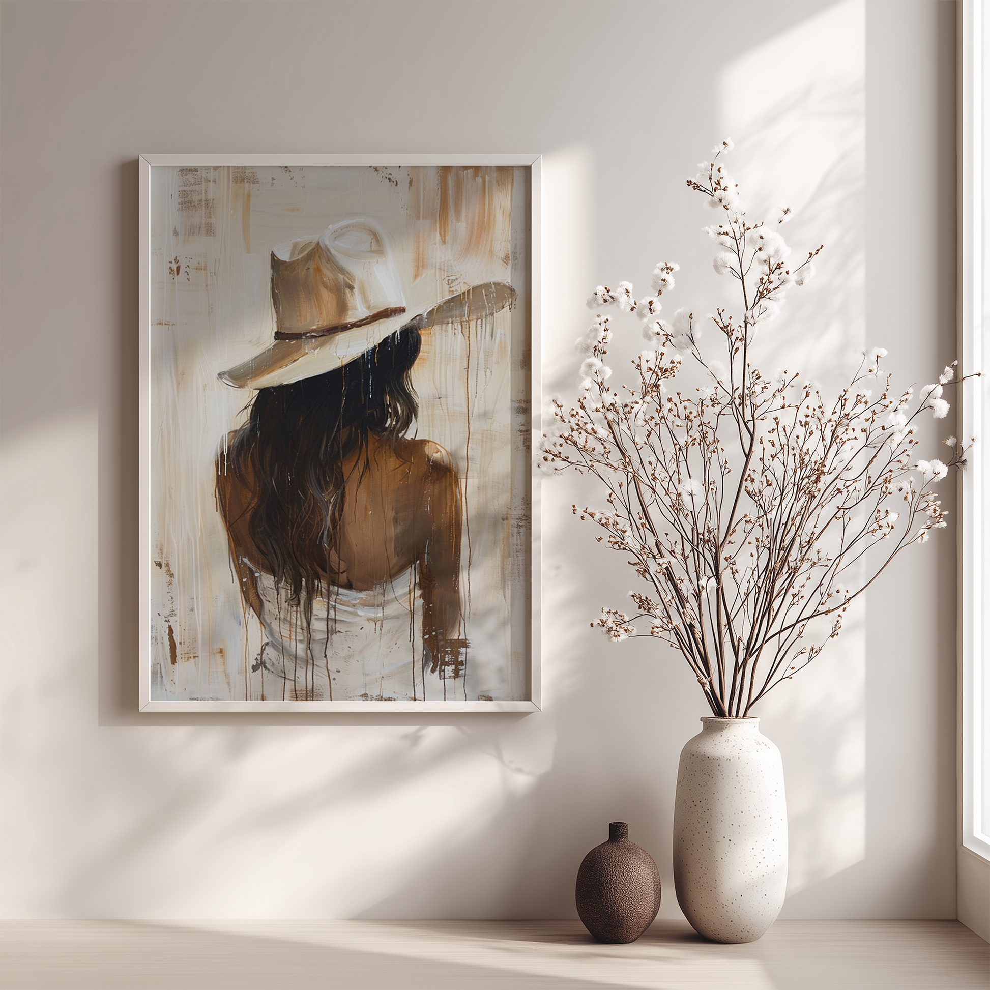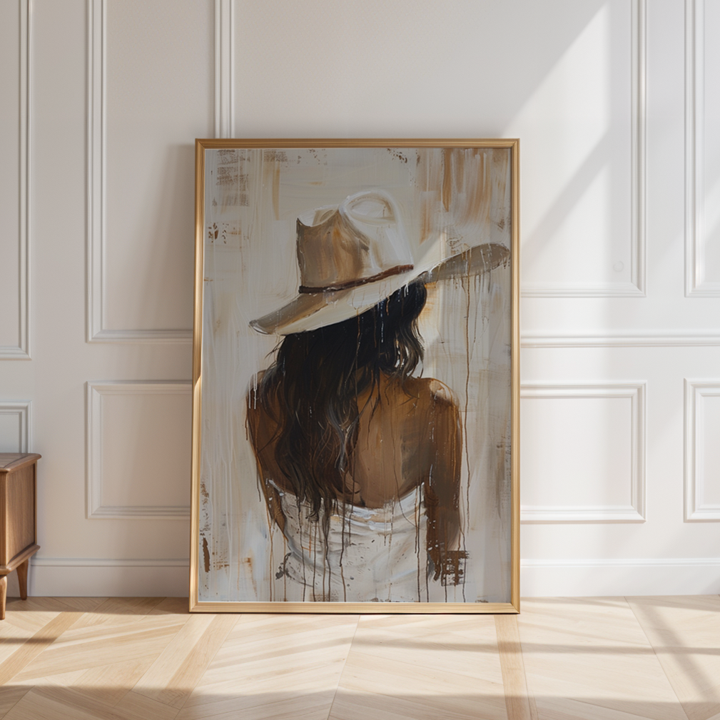 A painted cowgirl is shown from behind, wearing a light colored cowboy hat. Long dark hair falls down the back, with the body softly defined in warm brown tones. Loose brush strokes and paint drips run vertically across the surface, set against a muted off-white background, giving the piece a raw, textured, and calm presence.